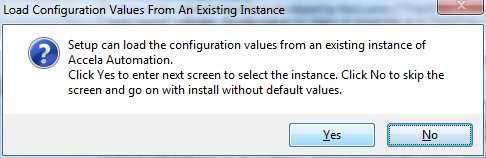 On the Load Configuration Values From An Existing Instance prompt, click No to manually enter the configuration values, or Yes to import the values from another installation.