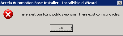 This error message displays if there are conflicting public synonyms and roles.
