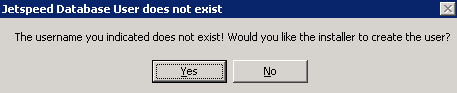 This message requests that you enter an existing Jetspeed user account for Jetspeed database.