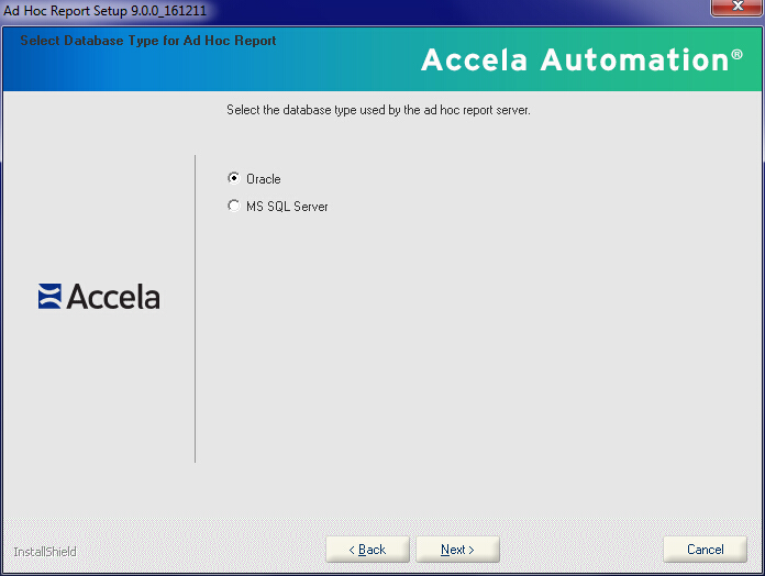 The Set up Oracle (or MS SQL) Server Database screen displays.