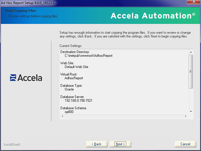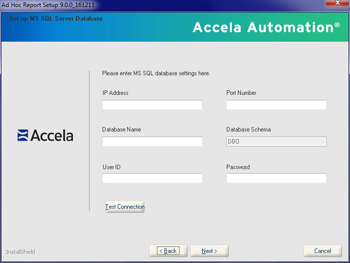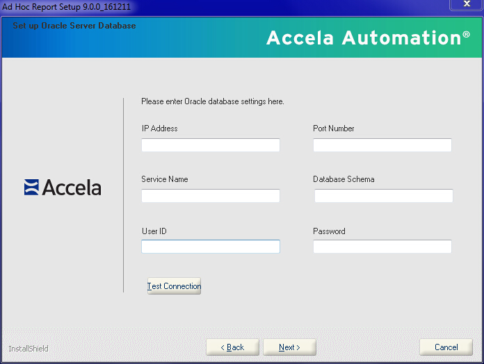 9. Enter parameter values for the Oracle database server or the SQL Server database server, and click Next.