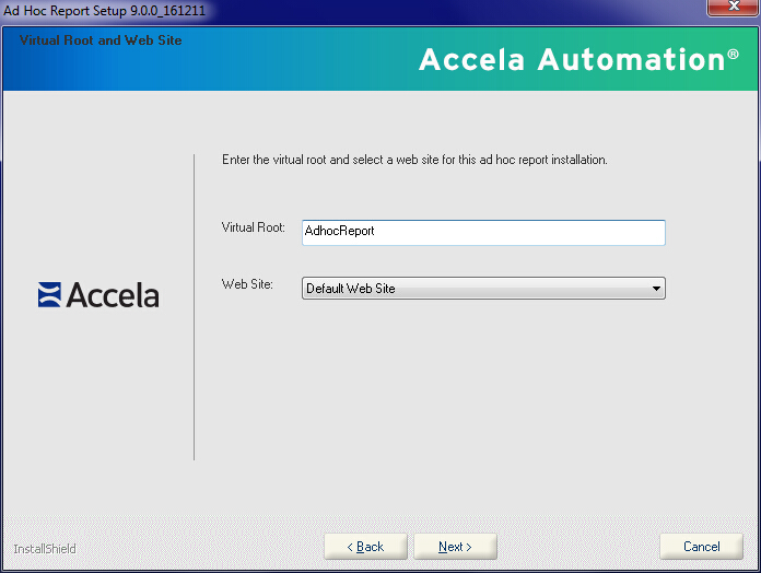 5. Enter the virtual root and select the website for your ad hoc report application. Click Next.