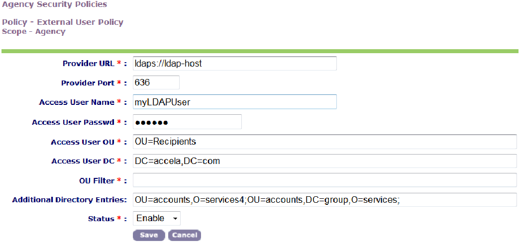 Table 1. Agency Security Policies Field Example Content Field Description Provider URL The LDAP server URL. You can use SSL LDAP with “ldaps://” URL. Provider Port The LDAP server port. For example, you can set the port to 636. Access User Name The user who accesses the LDAP directory. Enter the CN (common name) from the DN of the access user entry. Access User Passwd The authentication password of the access user. Access User OU The OU (organization unit) of the access user. Access User DC The DC (domain component) of the parent entry of the access user entry. Note:Civic Platform accesses the LDAP server with the following user information: CN=<Access User Name>,<Access User OU>,<Access User DC>.