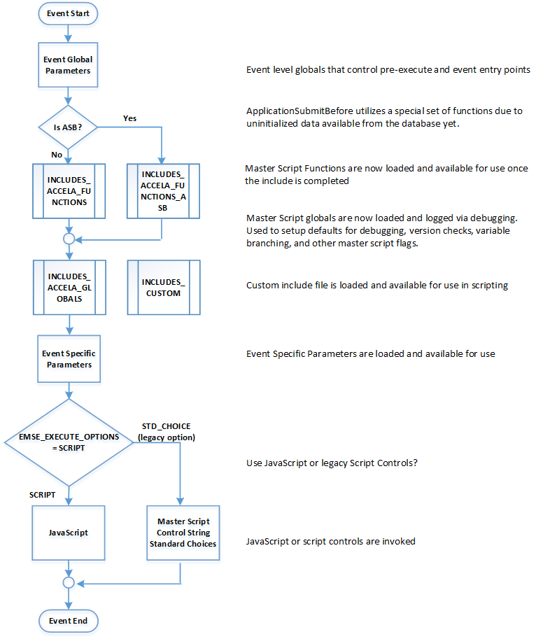 EMSE Execution Path shows that the master script execution process leverages four script include files.