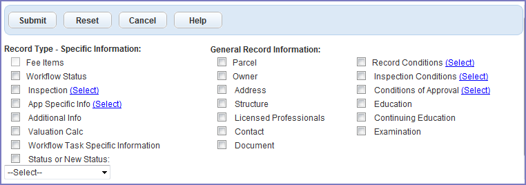 For example, if you click the Select link for Conditions of Approval, a dialog displays, prompting you to select which conditions to copy both by severity and by condition status.