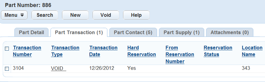 There may be various reasons to remove a part transaction. For example, you have a transaction associated with the wrong part or a transfer that never took place. You cannot remove part transactions because Civic Platform preserves the audit trail for the part, but you can void transactions. When you void a part transaction, it is no longer executable, meaning that the quantity on hand updates as if the transaction did not exist. The transaction record remains in the part transaction list for reference.