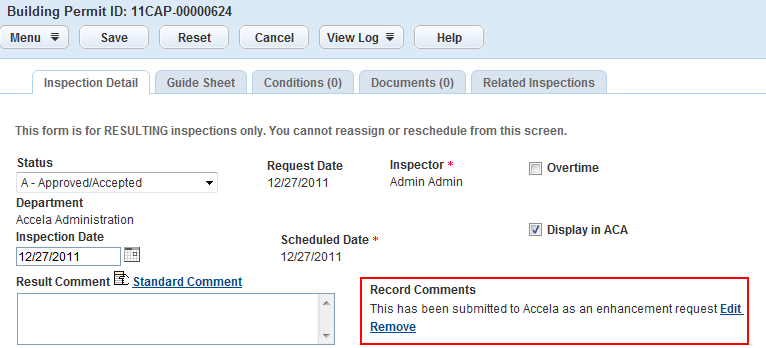 Civic Platform also displays the newly-added comment in the Record Comments field of associated inspections if “Apply to Inspections” = Yes.