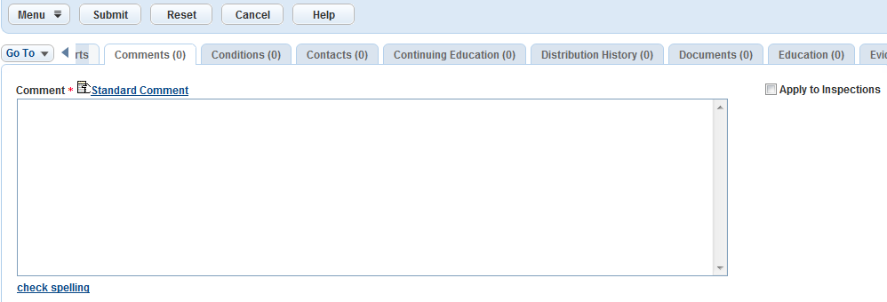 Your agency administrator can create a set of standard comments you can select from when completing applications, inspections, workflows, and checklists. When you assign a set of standard comments to a record type, inspection, workflow, or checklist, you can choose from a list of pre-written comments to populate the Comments field. This feature streamlines the form completion and improves data consistency.