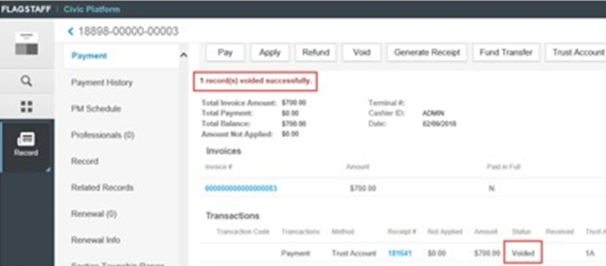 If you decide you want to take a few steps back, you must void the invoice, and then you can void and replace the assessment and put it on a new invoice. Civic Platform credits back the original payment to the customer. Civic Platform does not apply or attach the payment to anything, which allows you to take this payment and apply it to another invoice.