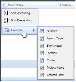You can further organize the search results by applying filters to the results set. Filter the records by module, if available. Click a column header to sort records by that column in ascending or descending order. You can also click the arrow next to the column header to access a drop-down menu with sorting and display options.