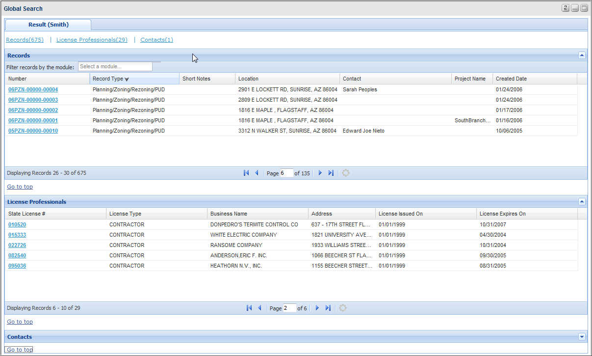 Civic Platform offers a global search engine that you can use to specify search criteria and locate the records that meet the criteria in a global scope. The global search checks in the following portlets for records that contain a field with the same value as entered in the global search field.