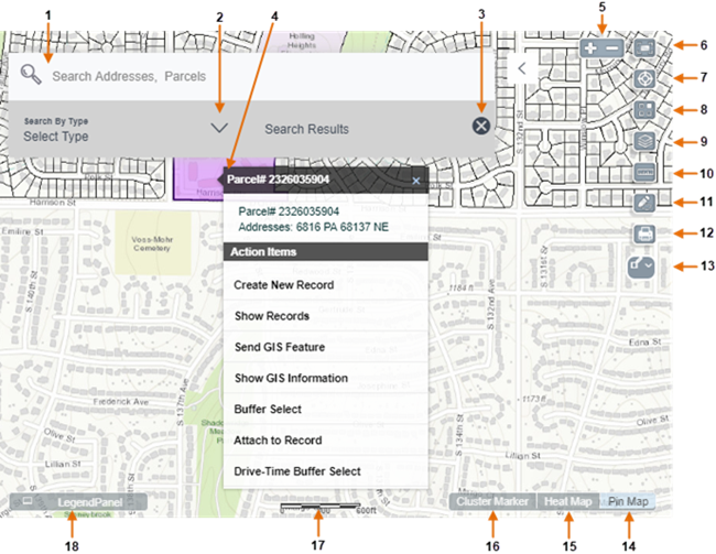 | 1: | Advanced Search feature searches by full addresses and parcels, gives users access to search for records, inspections, and GIS features. These items are plotted on the map. |