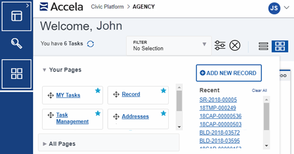 The Launchpad is your access point to just about everything you want to do in Civic Platform. What used to be individual portlets linked on the console bars are now organized as Pages in the Launchpad. Any link you click within the Launchpad opens a new space where you can interact with the data you selected.
