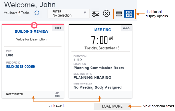 - A dashboard display options toggle lets you switch between the card view and the list view.