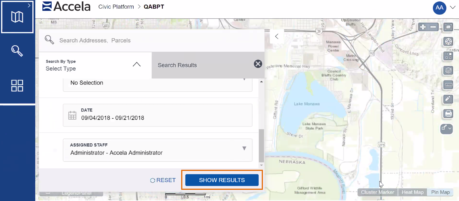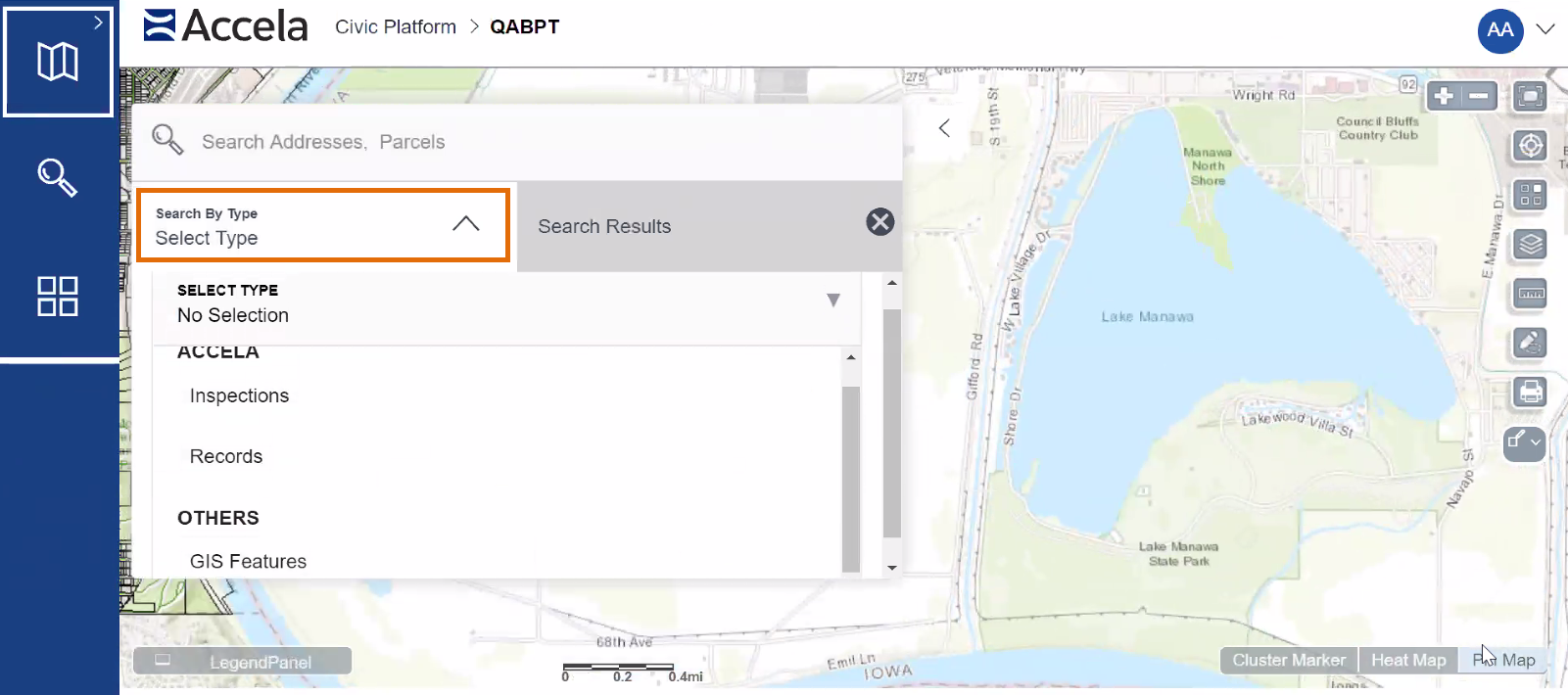 In this example we will search for records on the map using the Accela GIS Advanced Search feature. You can also search for inspections and GIS Features.